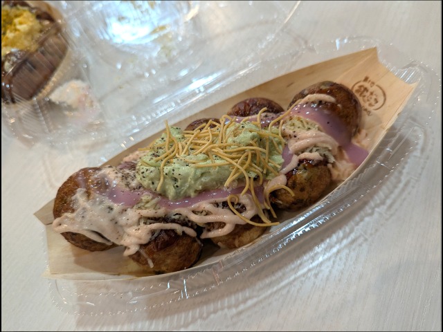 “特製醤油だれ”のたこ焼に、“モッツァレラチーズ’と“明太マヨ”、ヒソカのバンジーガムをイメージした紫色(天然由来の色素)の“モチソース’をトッピング。イルミのイメージカラーを表した店内仕込みの“アボカドサラダ”をのせ、イルミの針を“揚げ麺”で表現、ひそかに香る“黒胡椒”で仕上げました。 (公式サイトより) | 2026/1