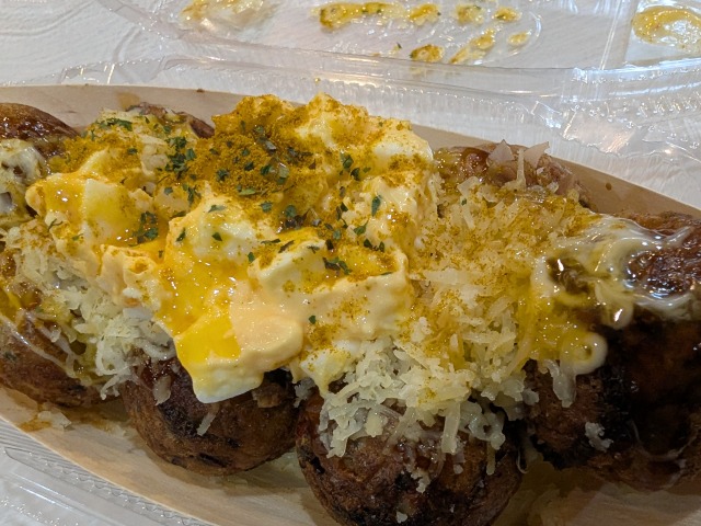 アツアツのたこ焼に「特製てりやきソース」をかけ、コク深いパルメザンチーズととろけるモッツァレラチーズをブレンドした「ミックスチーズ」、さらに店内仕込みの「たまごサラダ」をたっぷりトッピング。仕上げに濃厚な卵黄ソースを重ね、約30種のスパイスをブレンドした香り高い「カレーパウダー」をふりかけました。 (公式サイトより) | 2026/1