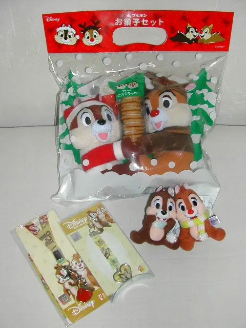 ブルボンお菓子セットはバニラクラッカーにチップサンタとデールトナカイのぬいぐるみつきです。他にハートやリンゴモチーフのストラップや、水色と黄色のマフラーをしたぬいぐるみもあります。